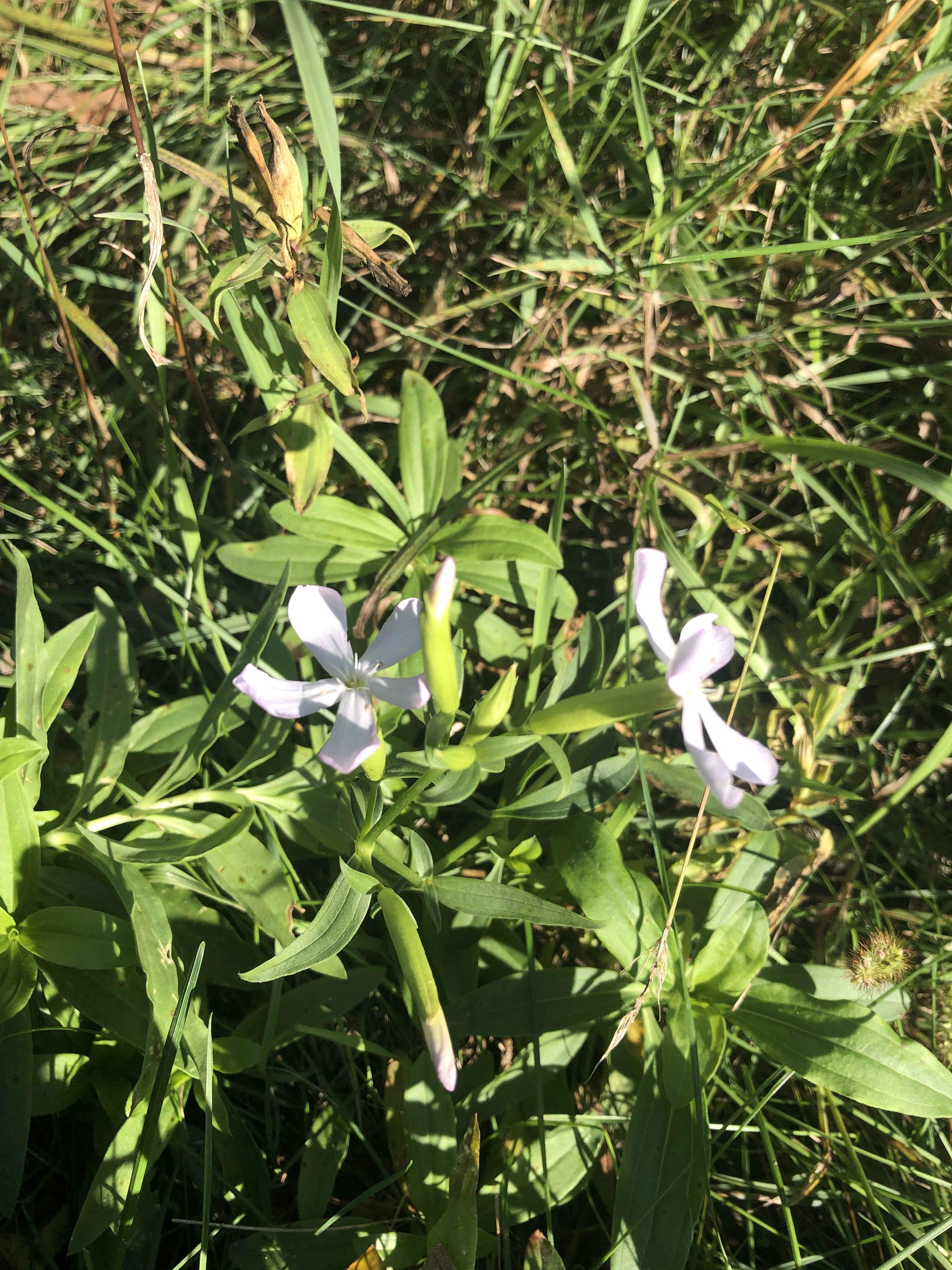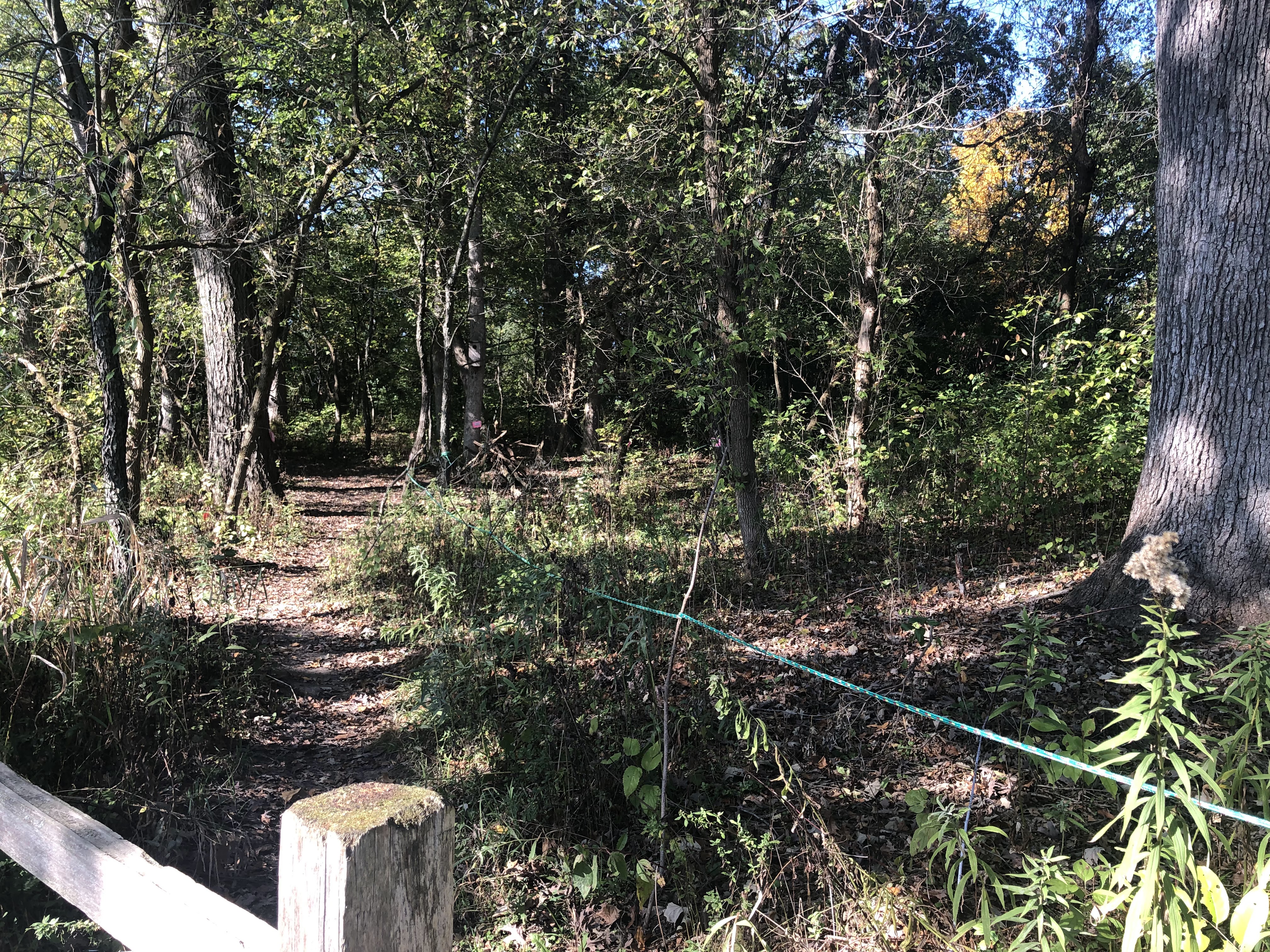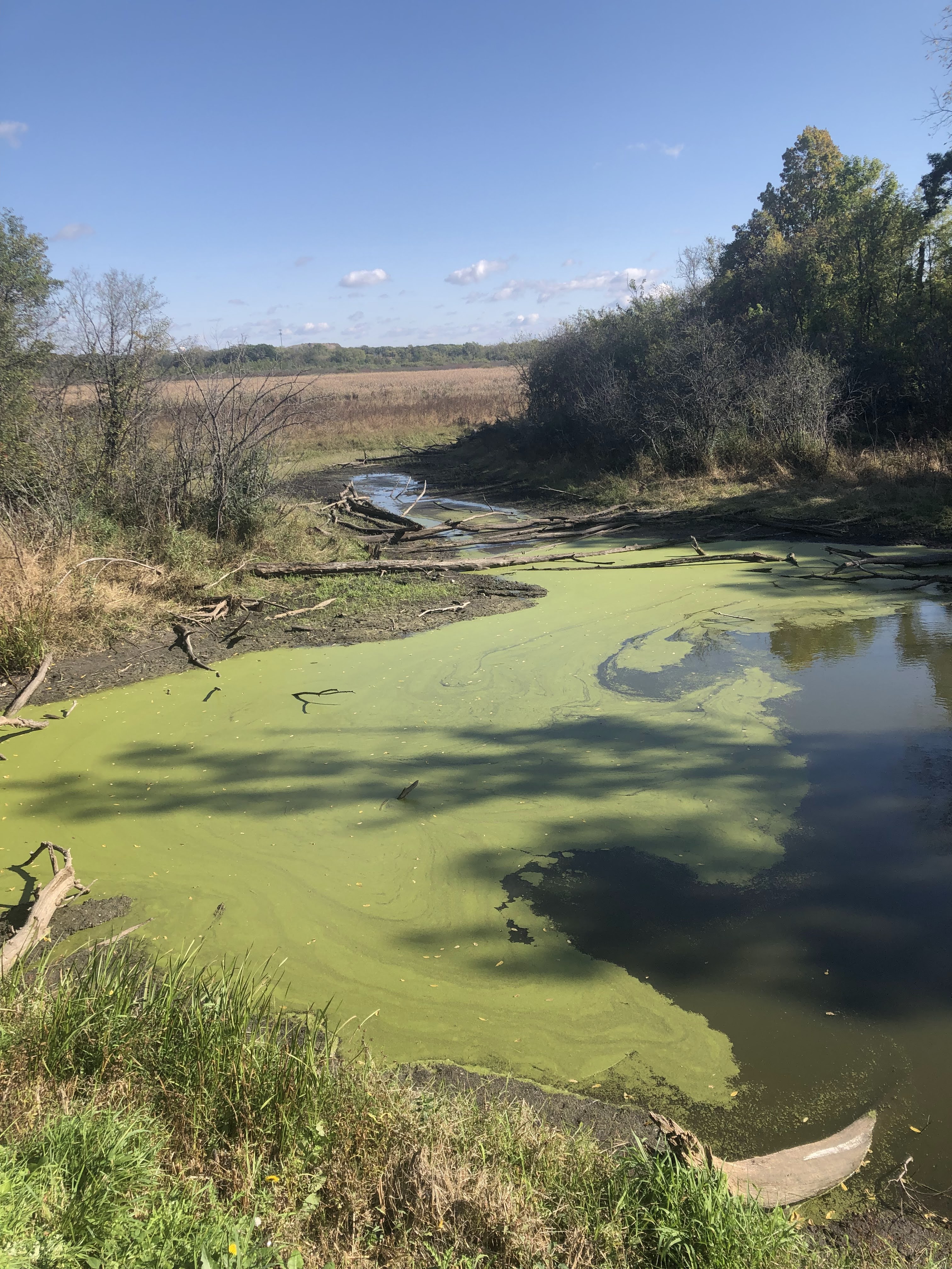 Past this first bog, the trial led to the prairie restoration. The path was clearly defined thru the grass and led to an observation platform, overlooking the hills. Of the three main prairie projects we’ve seen (the other two being James “Pate” Philip SP and Chain O’Lakes SP), we felt this one had the most interesting views of the fields. This was because the landscape had stretches covered in bright red plants. These turned out to be berries, and were everywhere. We were able to see some of these patches up close later on, and we did make several references to the TikTok trend while we were walking.