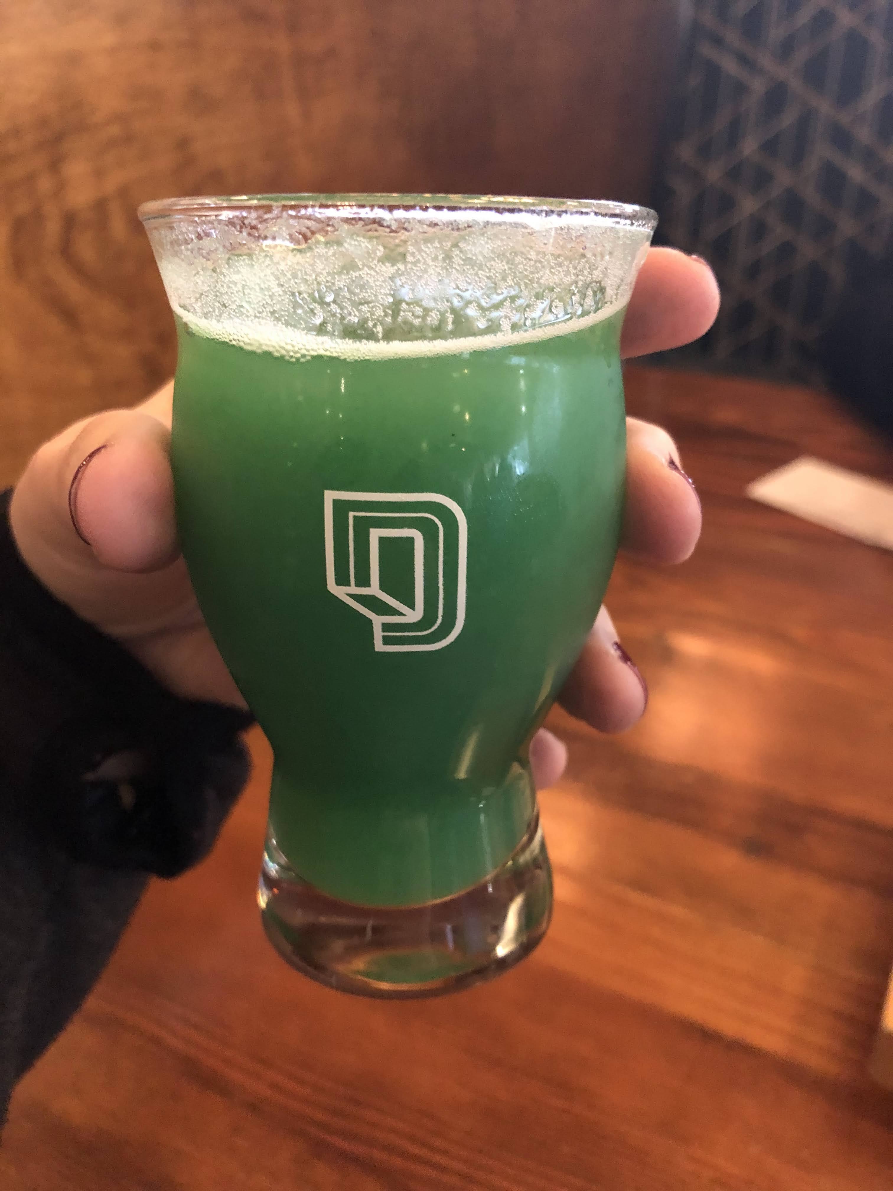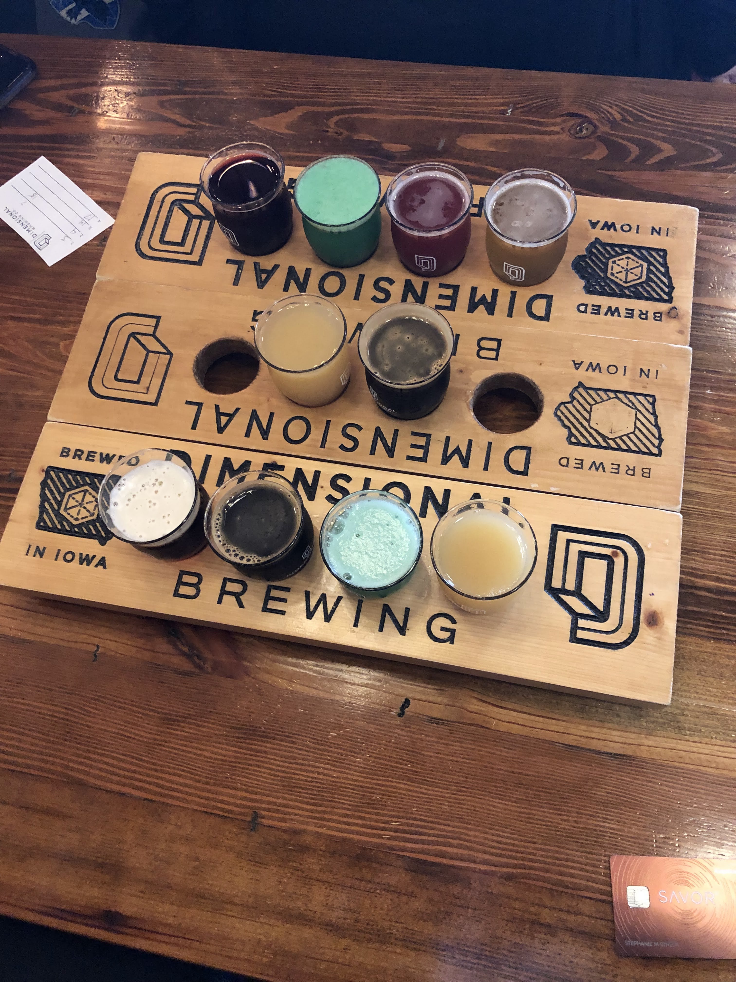After finishing, we crossed state lines and drove to Dimensional Brewing in Dubuque, IA. This was one of the places we went on our previous trip, and we were so impressed, we knew we would have to go back and talk about it. They do a lot of unique brews with fun names, and they’re constantly releasing new ones. Whatever your style preference, they will have something. One was a seasonal sour with pineapple and blue raspberry flavors, combined to make the beer green. It was definitely a gimmick, but it was still an unexpected and nostalgic flavor profile. We have not had anything bad here, and would highly recommend going.