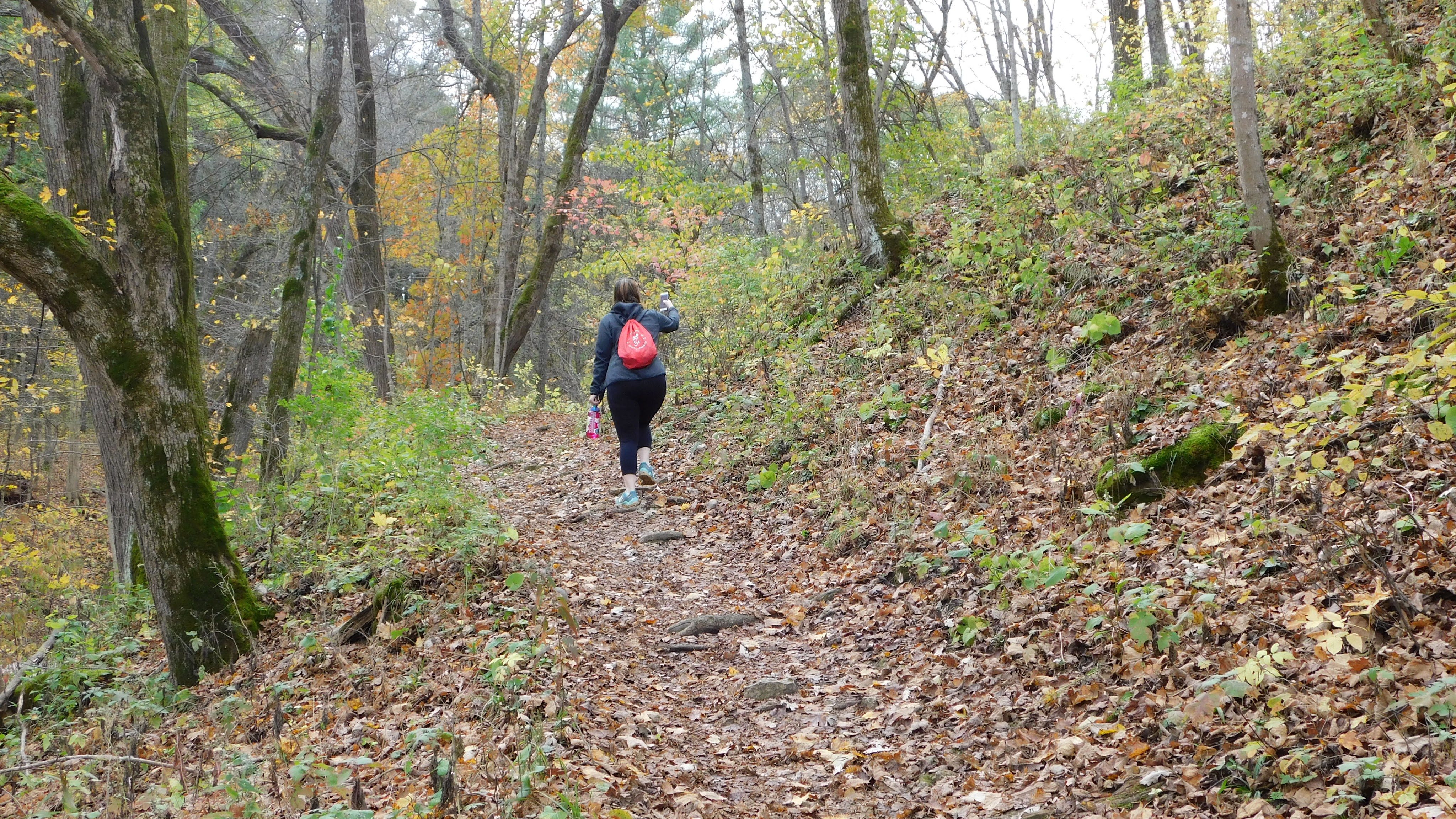 We arrived at around 11:30, and parked in the lot at the bottom of the canyon. We tried to pull up the trail maps on our phones, but found neither of us had cell service. This might seem silly to point that out, but out of all the parks we’ve been to, Apple River is the only one where this was a problem. We did get it back once we were on the first hill, so we could start tracking our route, but we did have to rely on a paper map for a bit. Fortunately, we both know how to read maps.