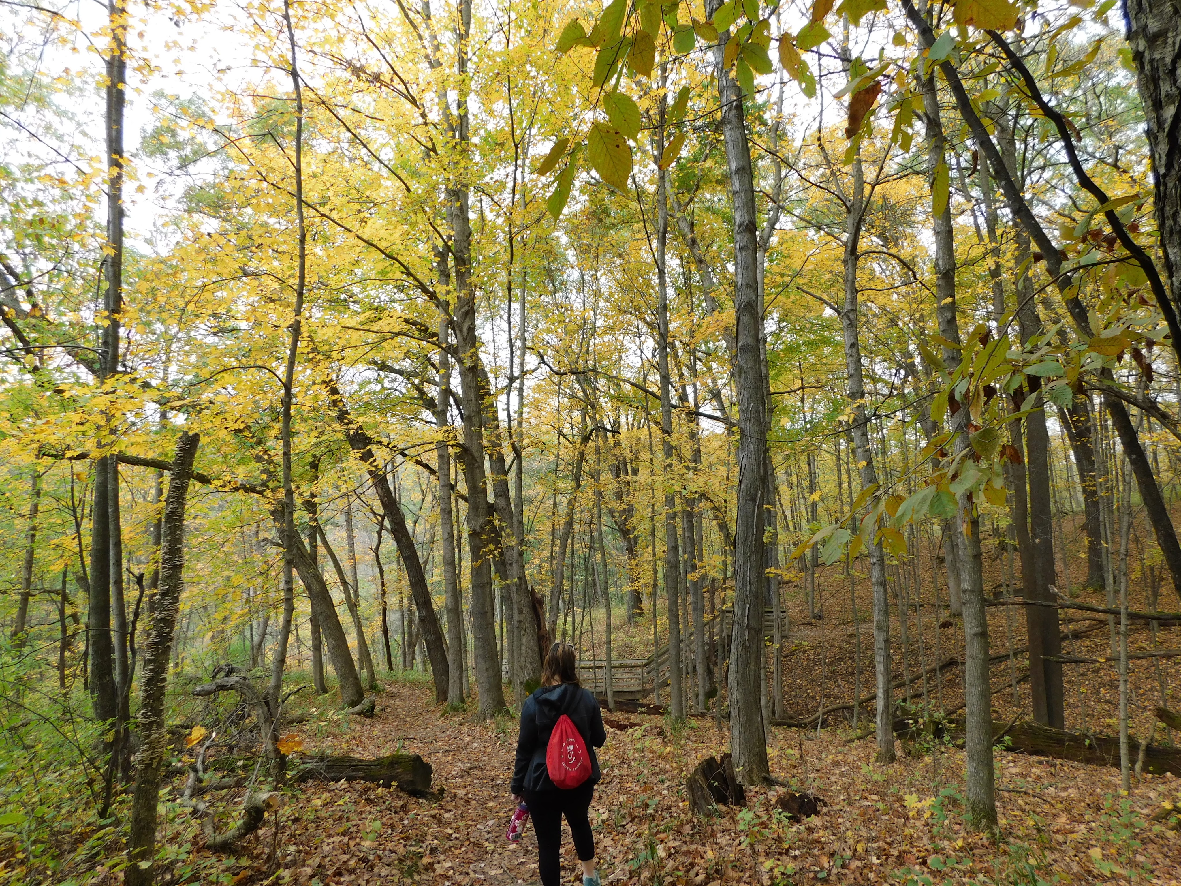The forest was very pretty and serene. The trees were all a golden yellow, and the path was covered in leaves. Most of the parks in Illinois have forested areas, but this one in particular somehow felt more forested. It’s hard to explain, but both of us felt this way. It was probably because we were the only people we saw out on the trail, and there was less evidence of people being around before us. The few structures built to make access easier were all old and weathered. In fact we couldn’t go the full mile because we would’ve had to cross a bridge that looked like it needed repairs.