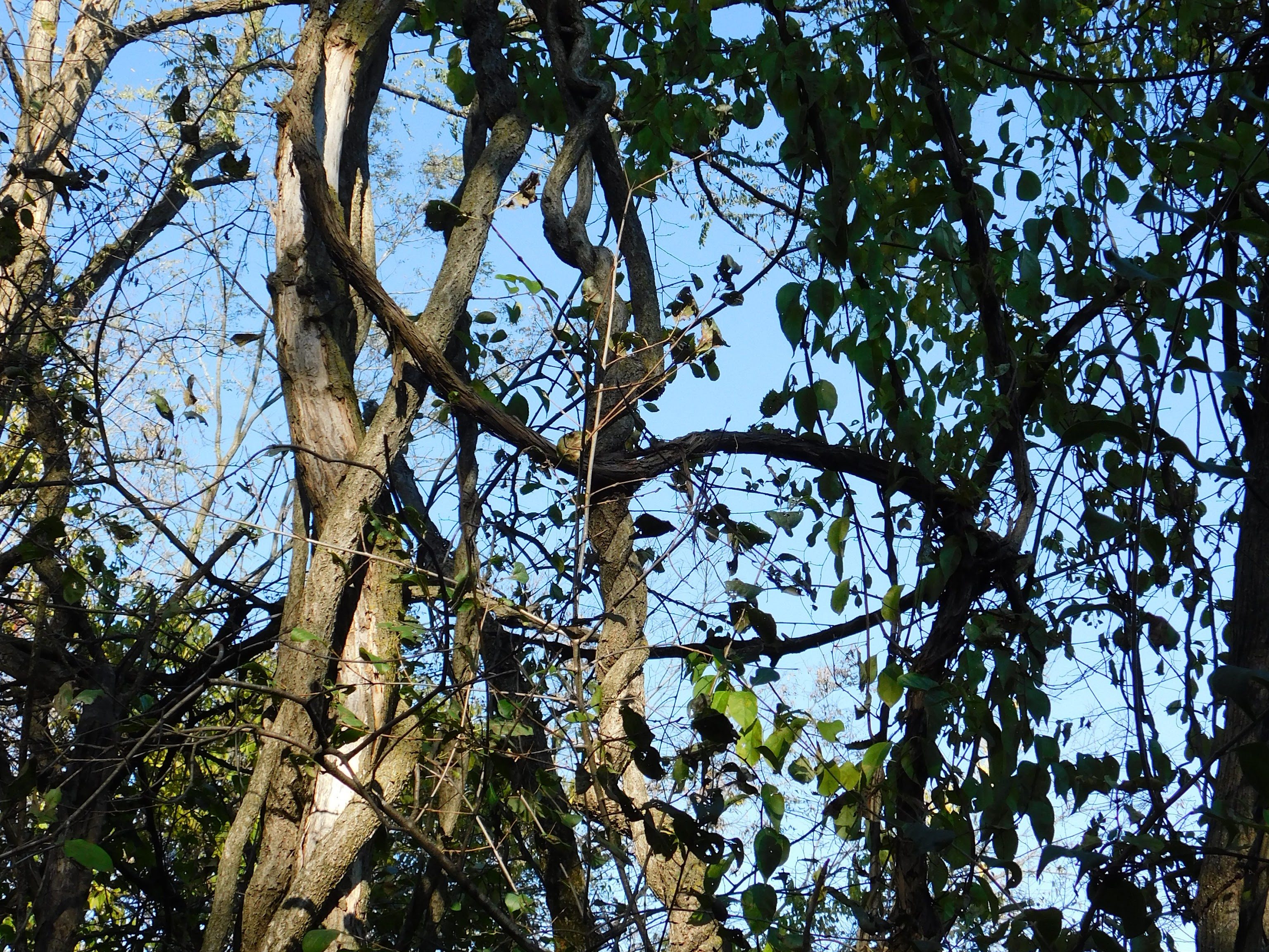 While walking, we kept talking about how this trail felt the most like an enchanted forest. This was partially from the amount of birds (seriously, there were so many) and partially because of the weather. The sun was bright, it was quite cool out, and there wasn’t a cloud in the sky. But the most prominent factor for this magical vibe was the plant life. We saw a lot of mushrooms, which is not uncommon in itself, but the scale was completely different. There were tiny ones growing by the river, only noticeable by kneeling down to look, and giant ones growing at the tops of the trees, much bigger than the portobellos found in the grocery store. There were also trees where the branches were twisted tightly around each other. This type of twisting is usually caused by people manipulating stems on very young trees, and leaving them to become sturdy in unlikely shapes. It was really interesting to see this, especially since it would have been done many years ago. What’s more, there was more than one tree we saw like that. Definitely not something we expected to see while we were out.