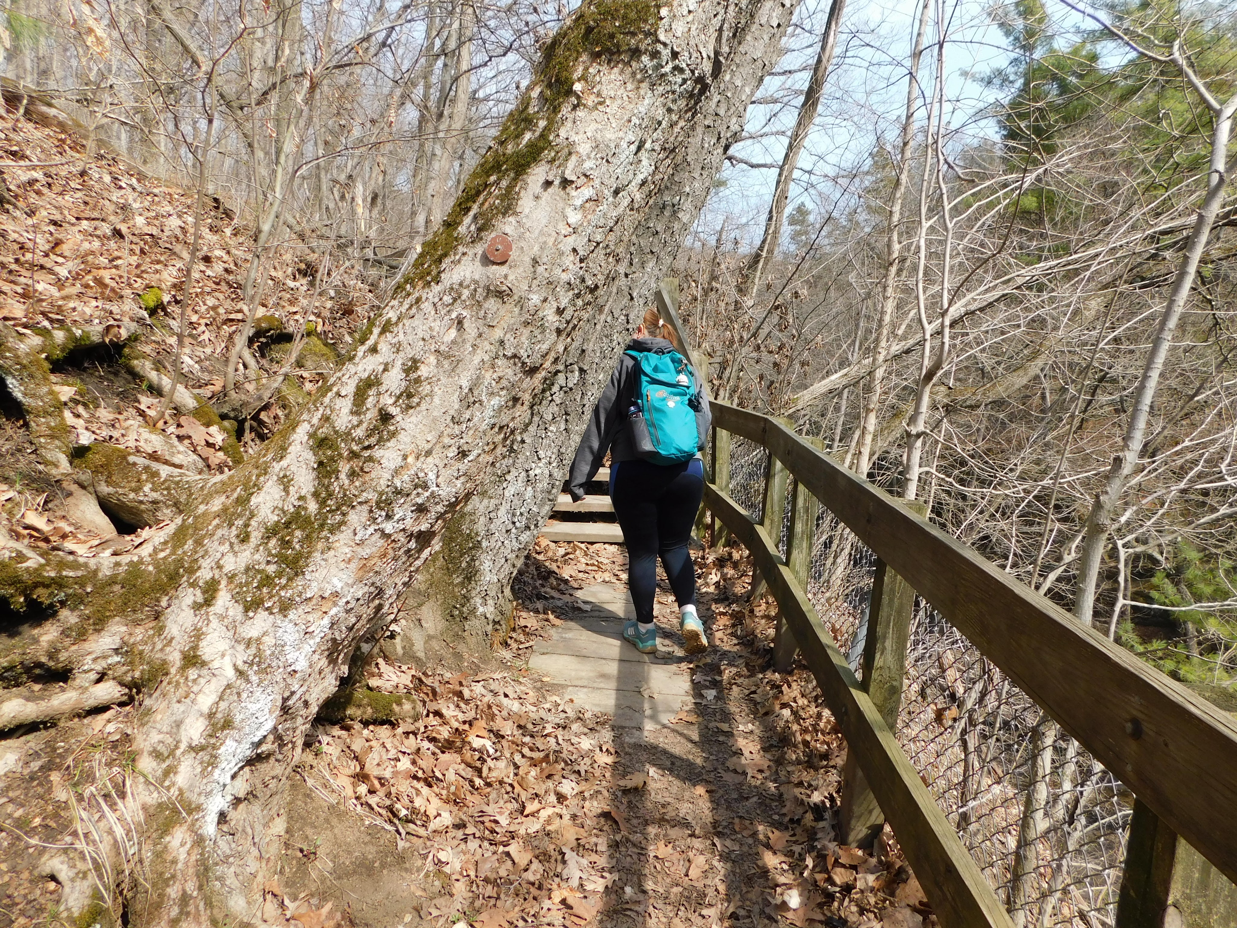 We started our day by parking by the log Fort, and heading down the steps to get to the Bluff trail, a 2.2 mile trail that loops around the tops of the canyons, with a few bridges that allow you to get from one side to the other without going down.