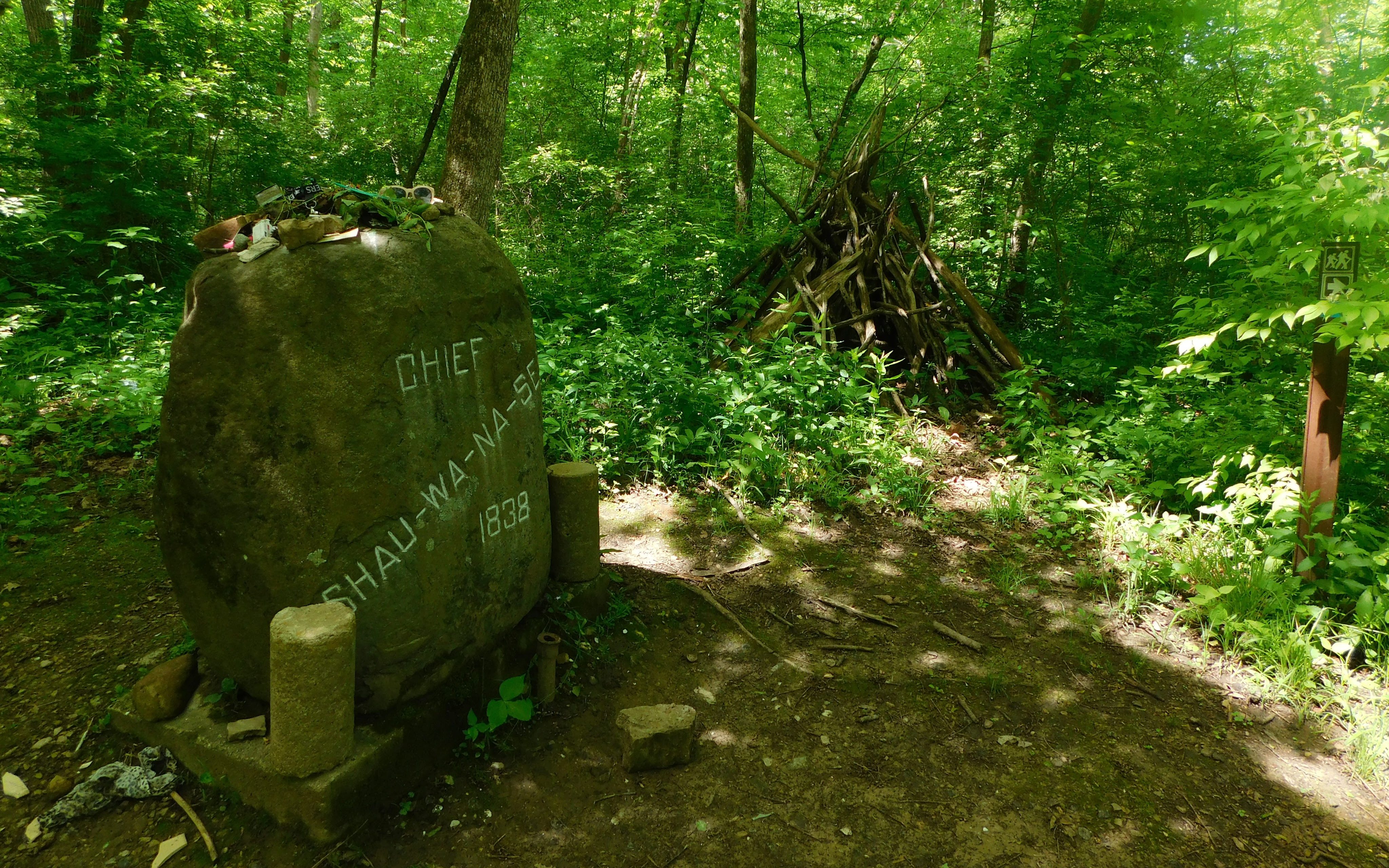 Aside from the main trail being beyond our skill level, we wanted to do the smaller loop trail for several points of interest including the grave of Chief Shaw-waw-nas-see. A large boulder noting his name and the year, with a nearby sign indicating that he really was buried near this spot.