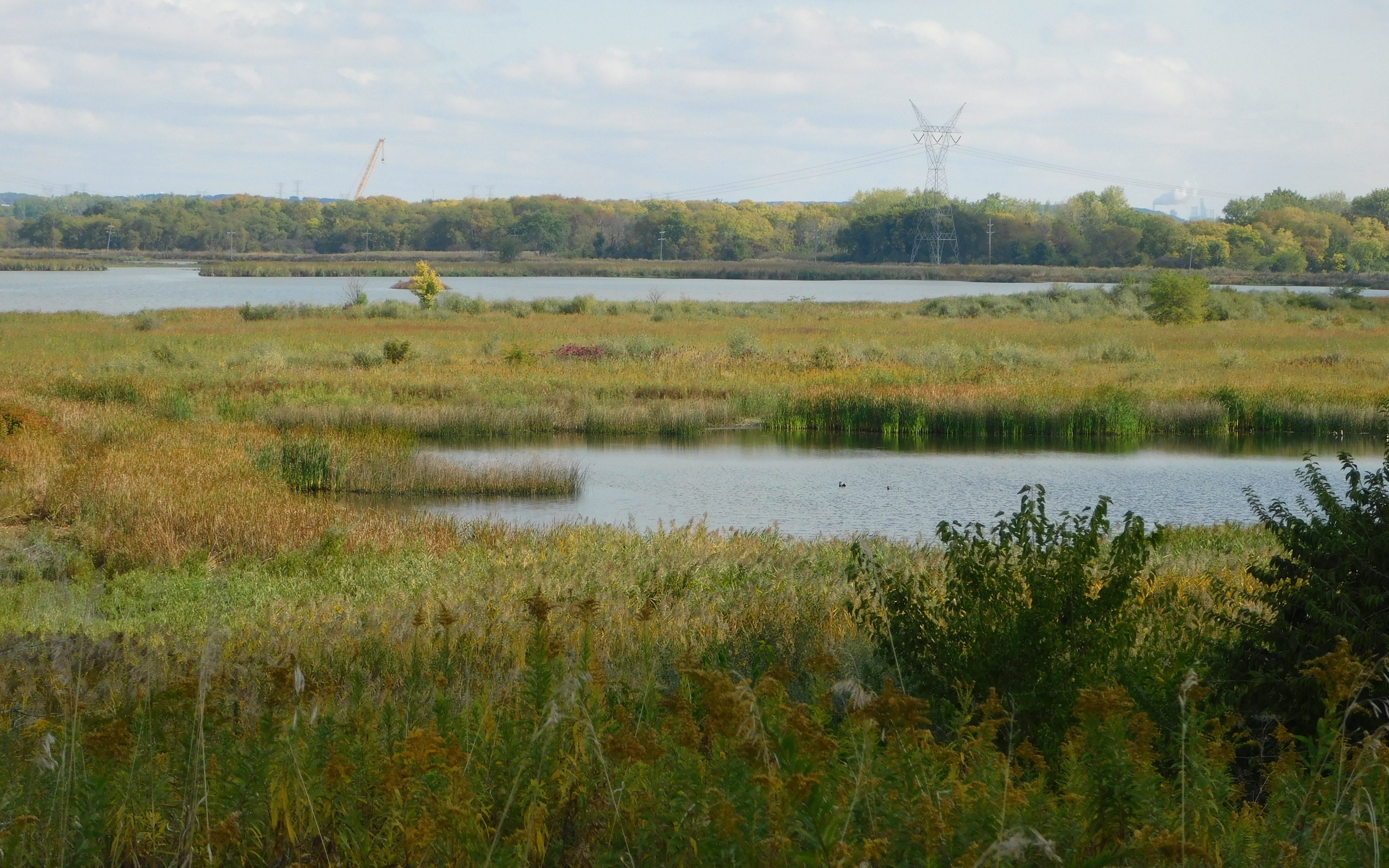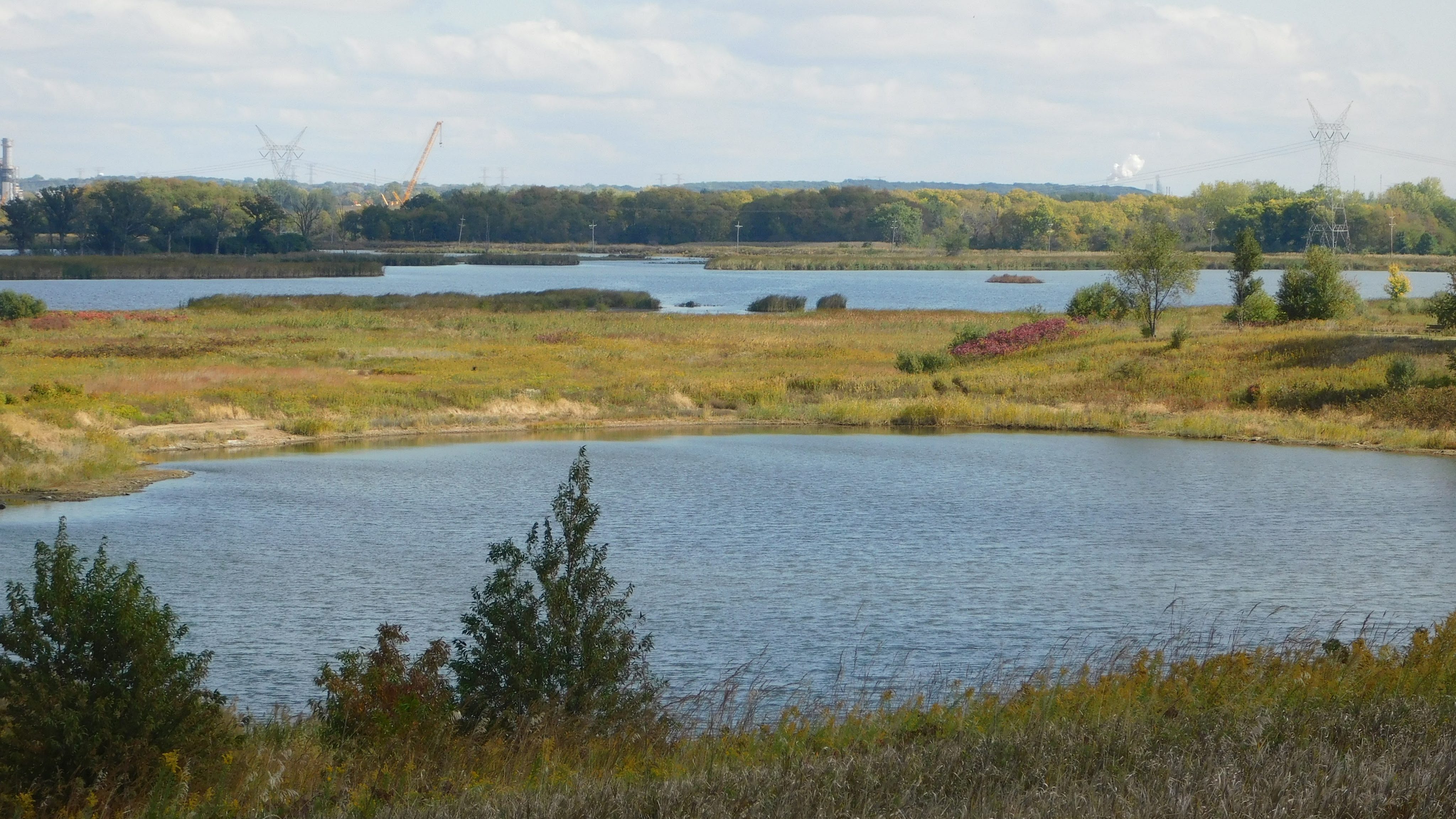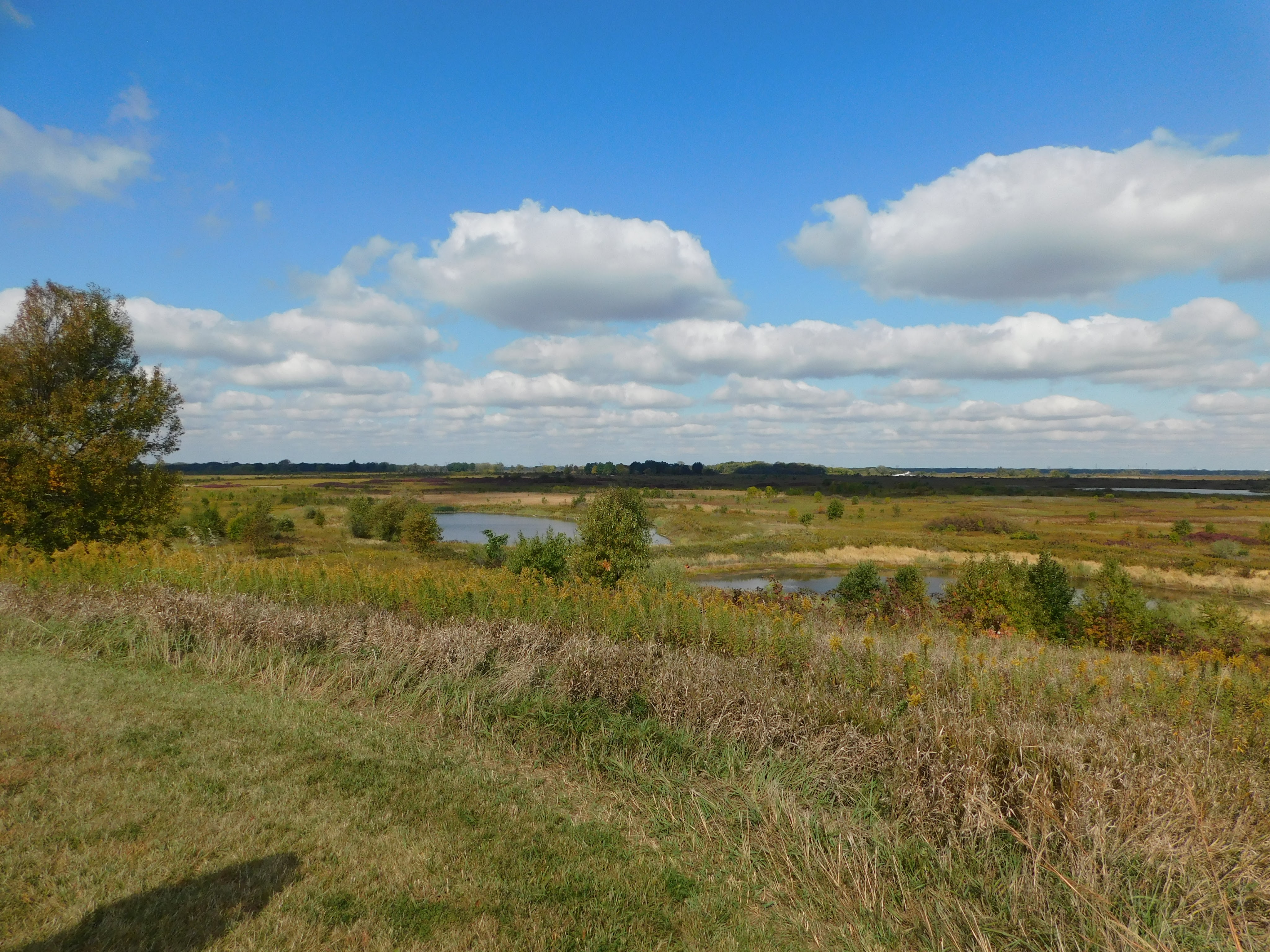 Finally getting to the other side of the pond, the path curves in a way that does not allow you to see what is waiting for you. In fact, we barely realized that we were going to be headed up a hill until we were at the base of said hill looking up. On top of what used to be a surface mine spoil mound is a couple of benches overlooking all of the surrounding marshes, prairie, and even industry in the distance. We were not expecting to have such great views here.