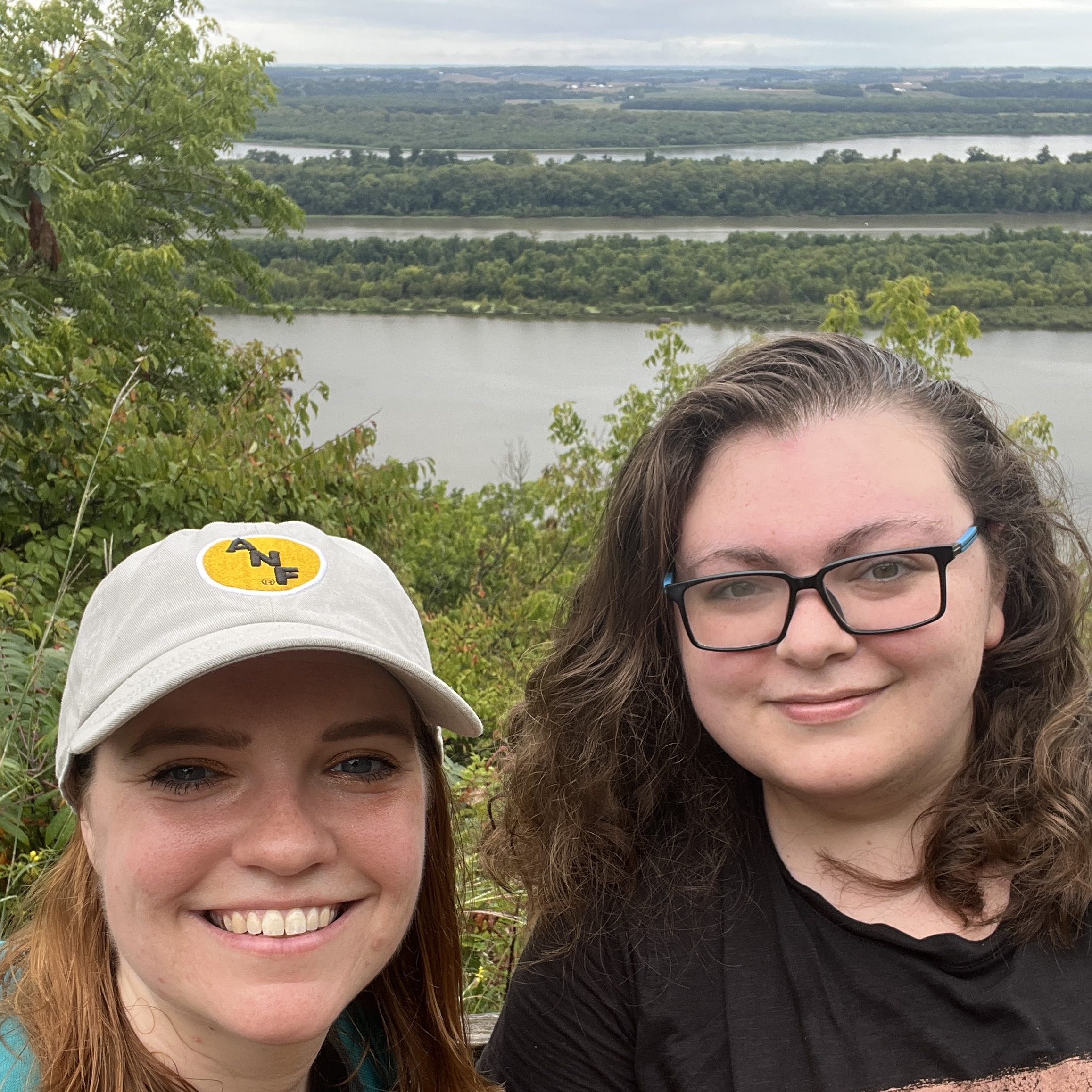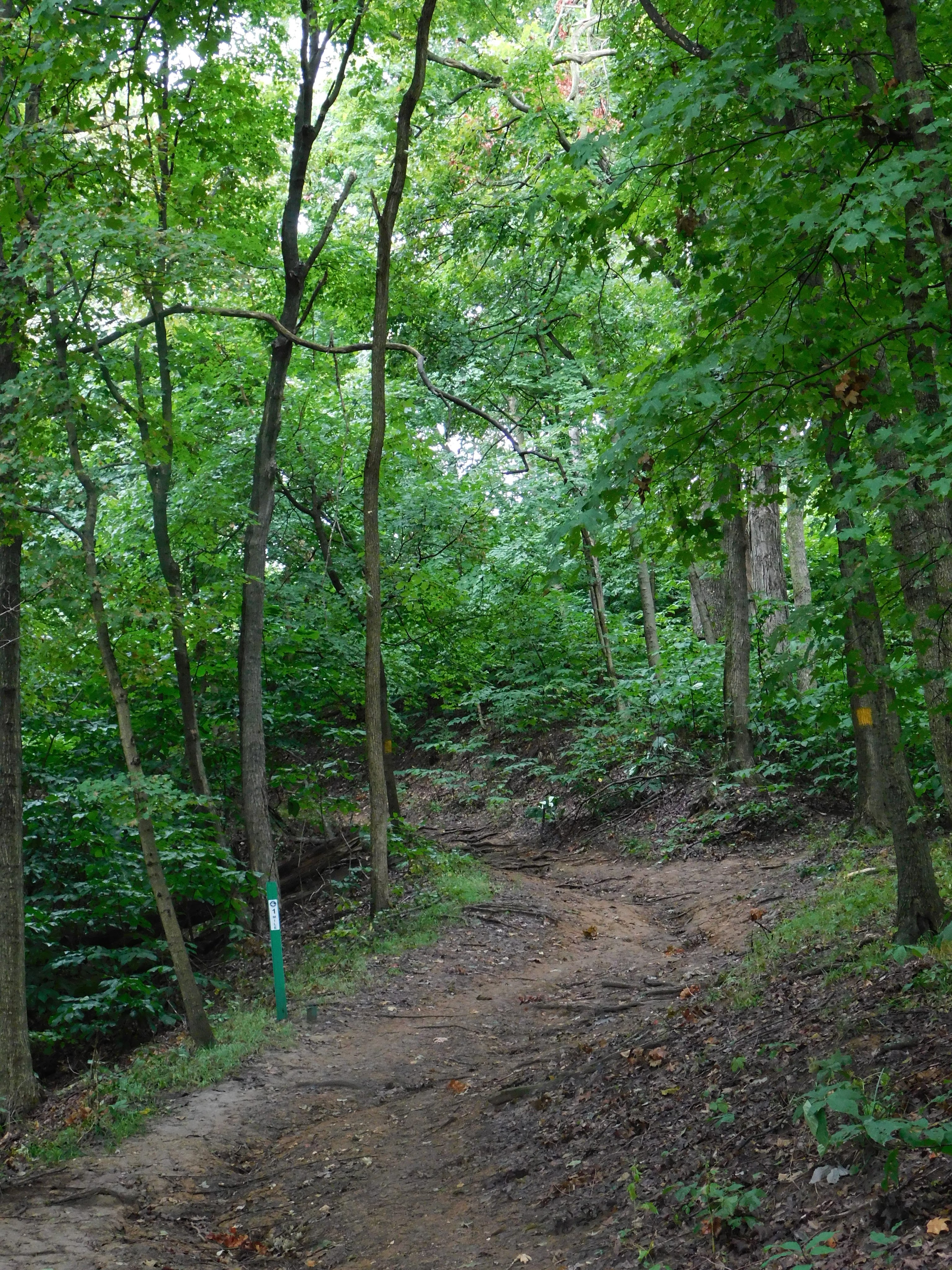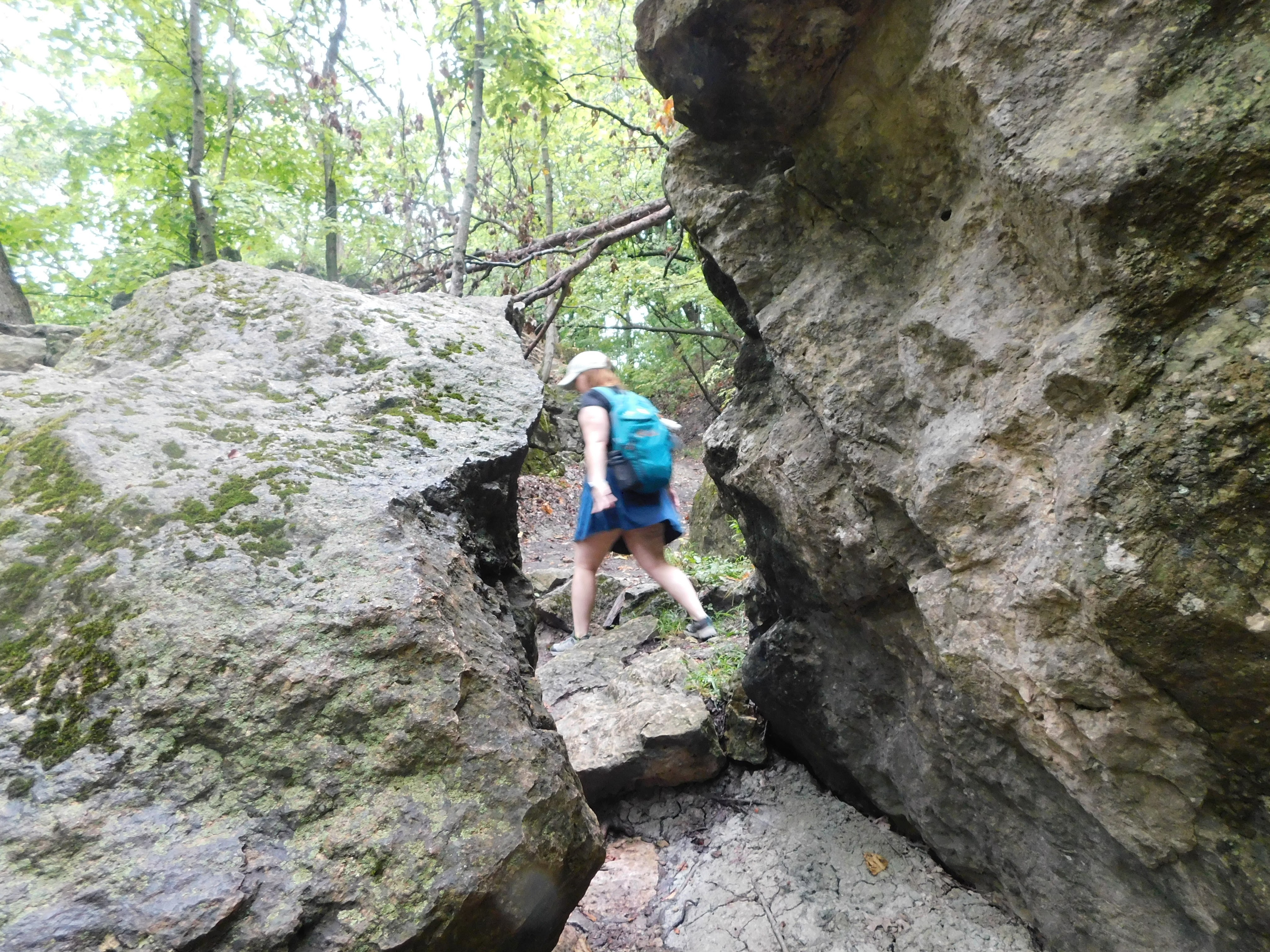 Because this park features bluffs and rock formations, the trails do have a pretty intense incline in some places. The Goat Cliff Trail is basically all uphill until you reach McAdams peak. There were also a couple moments of needing to follow the trail through a narrow opening between the rocks. After McAdams peak and you start going back down, there are points where the trail gets very narrow, so much so that your group may opt to go single file. At the point where Goat Cliff met Ridge, there was such an intense incline that both of us had to grab the conveniently placed metal post in order to make it up (one of the very few trail markers that was not painted on a tree). This is to say, this particular park may pose a challenge to hikers just starting out. However, we feel that the experience of hiking here and especially the views of the river are absolutely worth the trip. Getting to the overlook made us feel very accomplished, and we were having an exceptionally good time hiking the entire time.