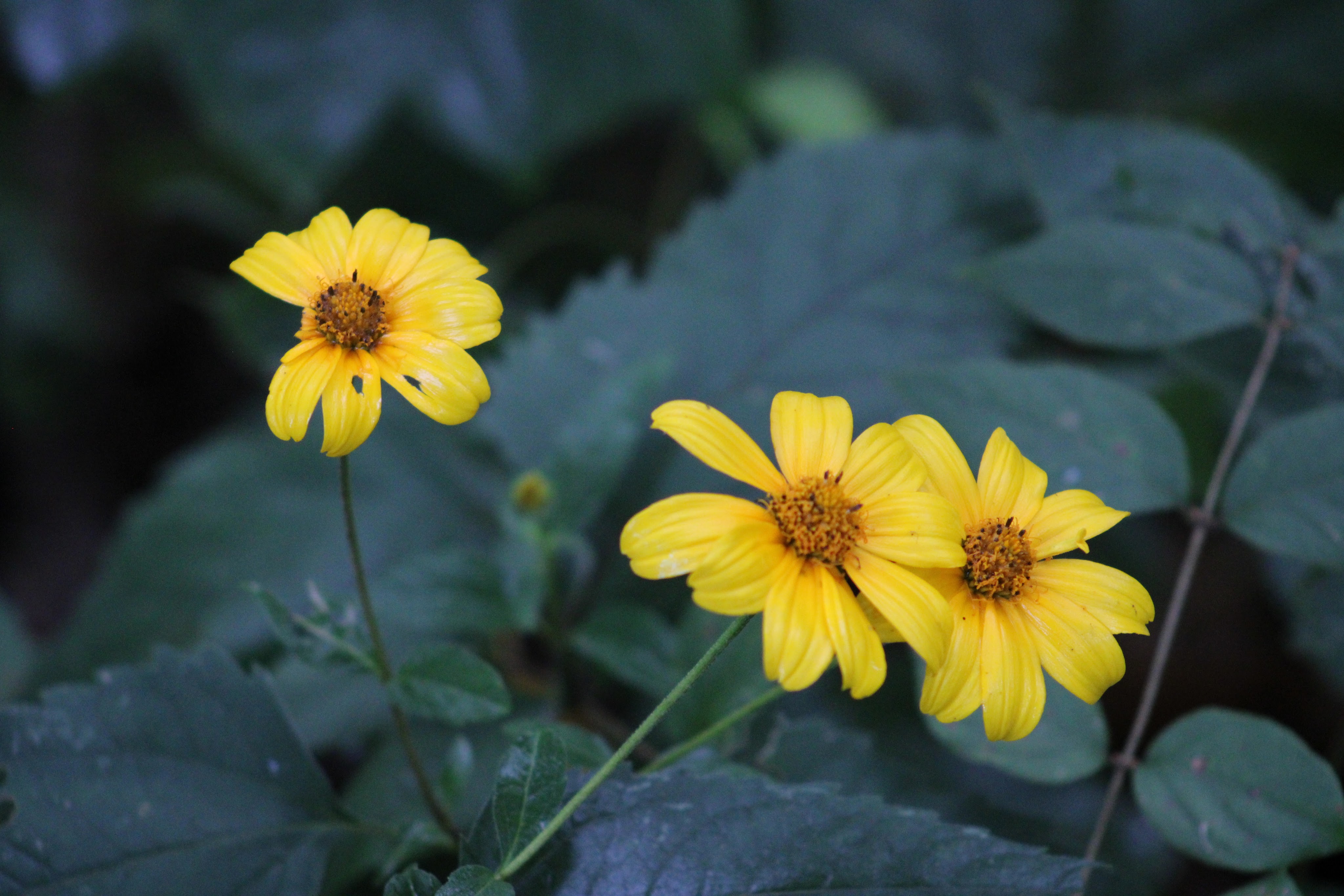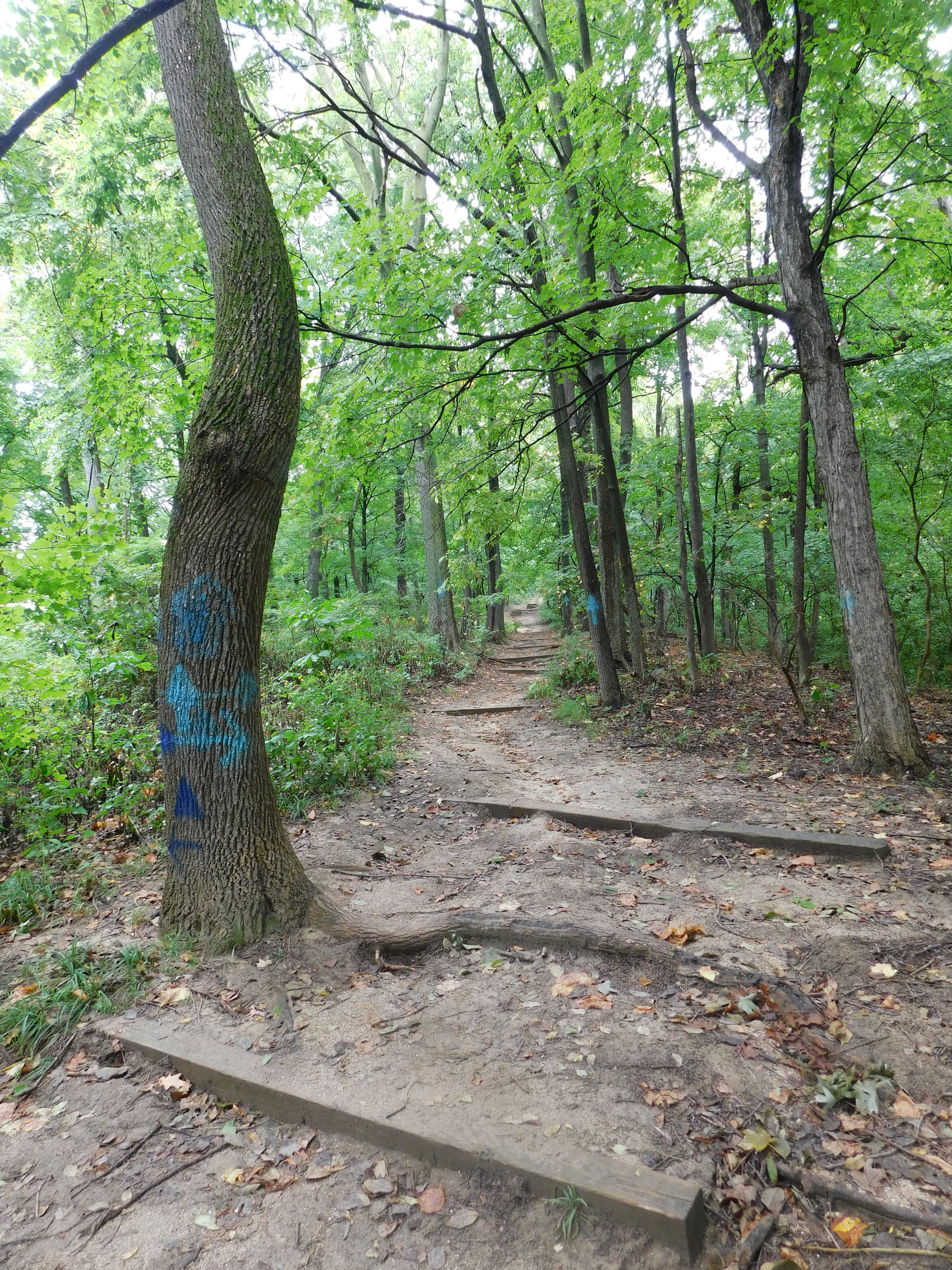 We got to this park bright and early on an overcast Saturday morning. We stopped into the visitor’s center and looked around briefly before heading out to start our hike. There are several trail options all over the park, and they are some of the most well marked trails we have come across in all of the parks we have visited so far. Regardless of which trail (or combination of trails) you choose to hike, something you will notice very quickly are the color-coded symbols spray painted on some of the trees. The trails we hiked were the Goat Cliff trail up to McAdams Peak, and then the Ridge Trail and the Dogwood Trail back down. Goat Cliff had yellow squares, Ridge had light blue arrows, and Dogwood had dark blue triangles. These symbols are also notated on the paper trail maps, making it even easier to find your way (the printed map may not show the symbols in color, but the color is still listed.) These painted marks on the trees can be seen in the pictures we took, and the sheer quantity of them made us feel very confident in where we were going.