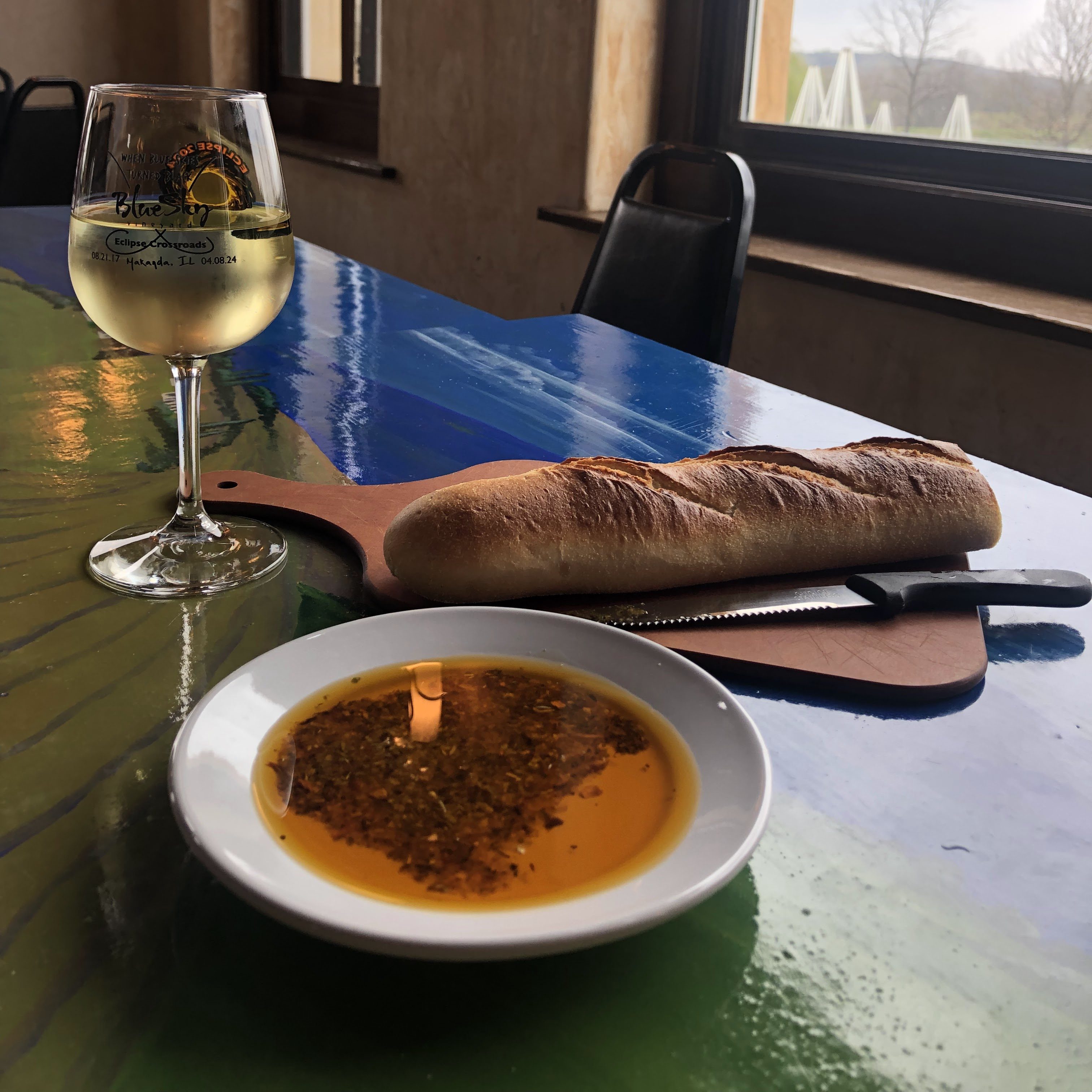 The first winery we visited was Blue Sky Vineyard. This winery usually has a lot of places to sit and enjoy wine outside, but they had not opened everything up the day we were there. So we sat inside and enjoyed the Italian inspired ambiance. The wine was very good, but they also had a bread and oil dish that we would recommend having with the wine.